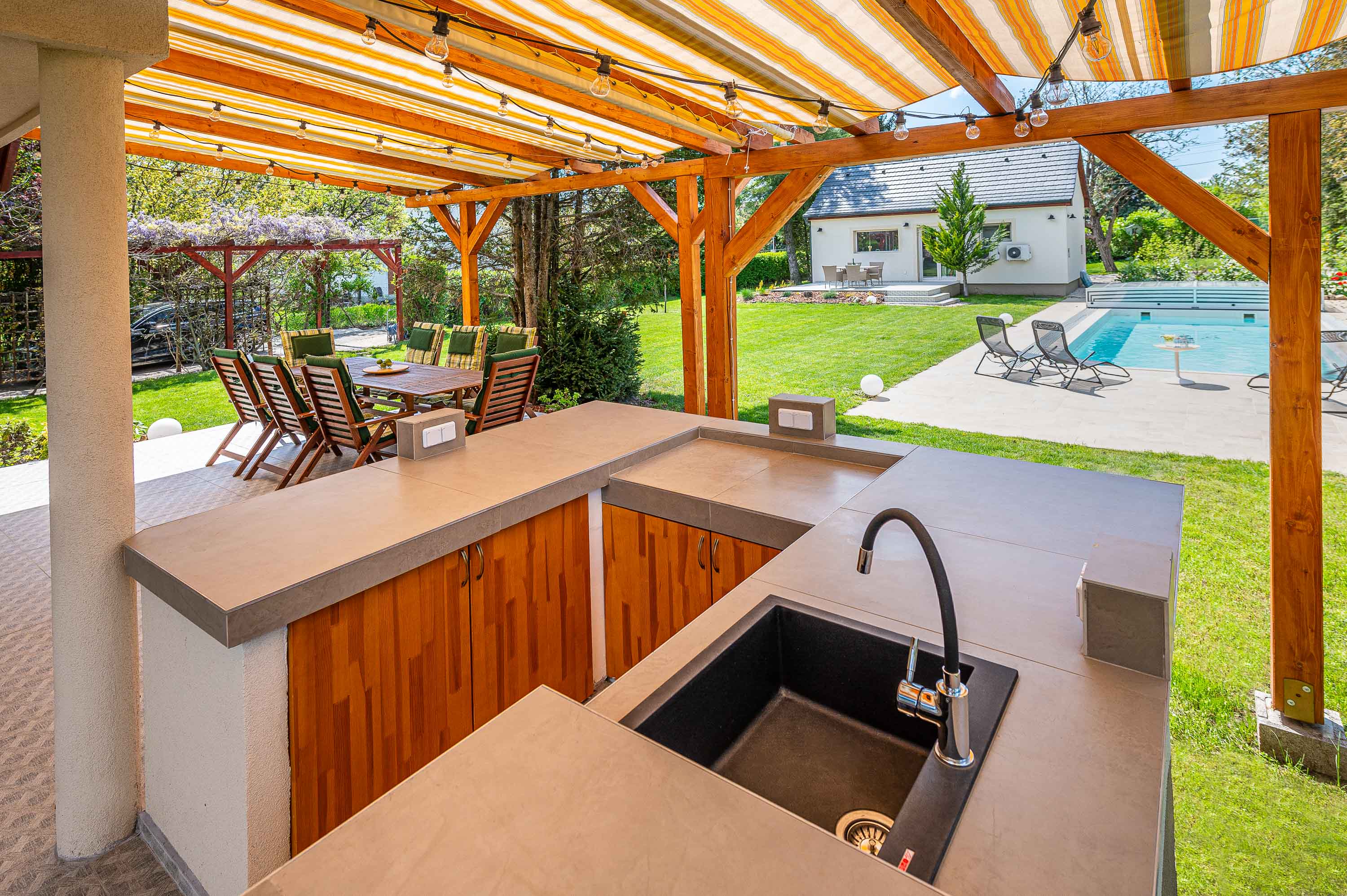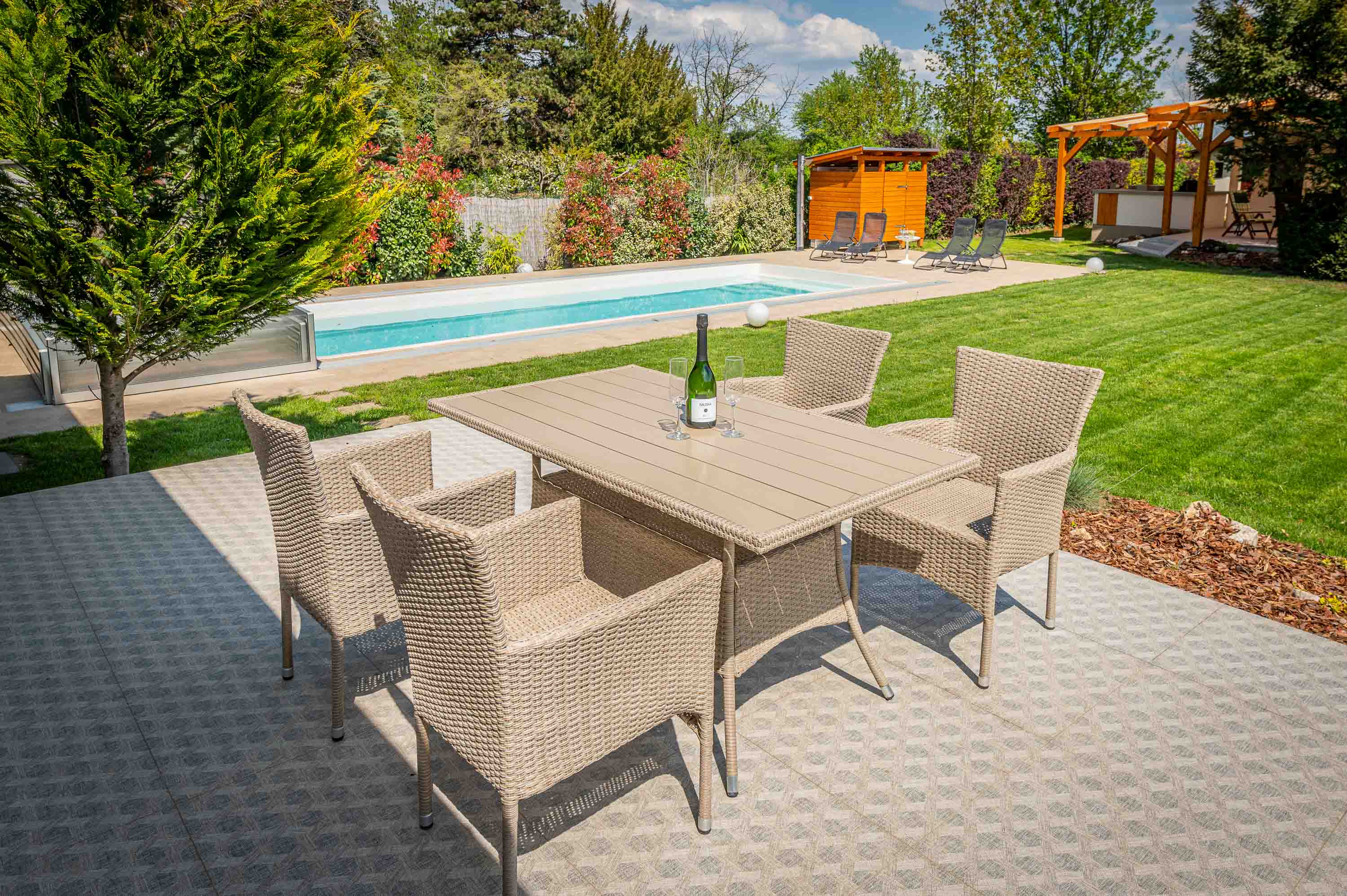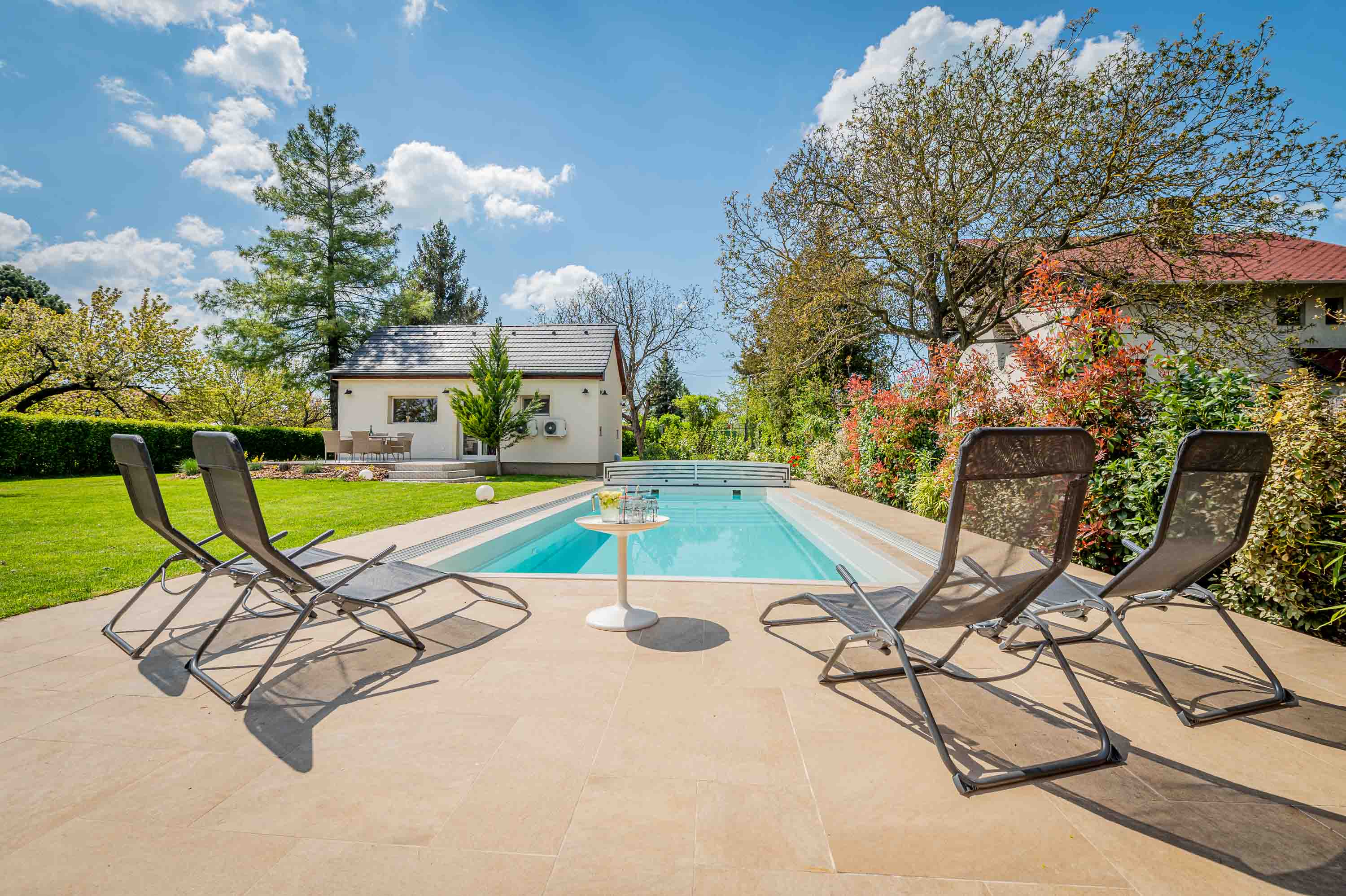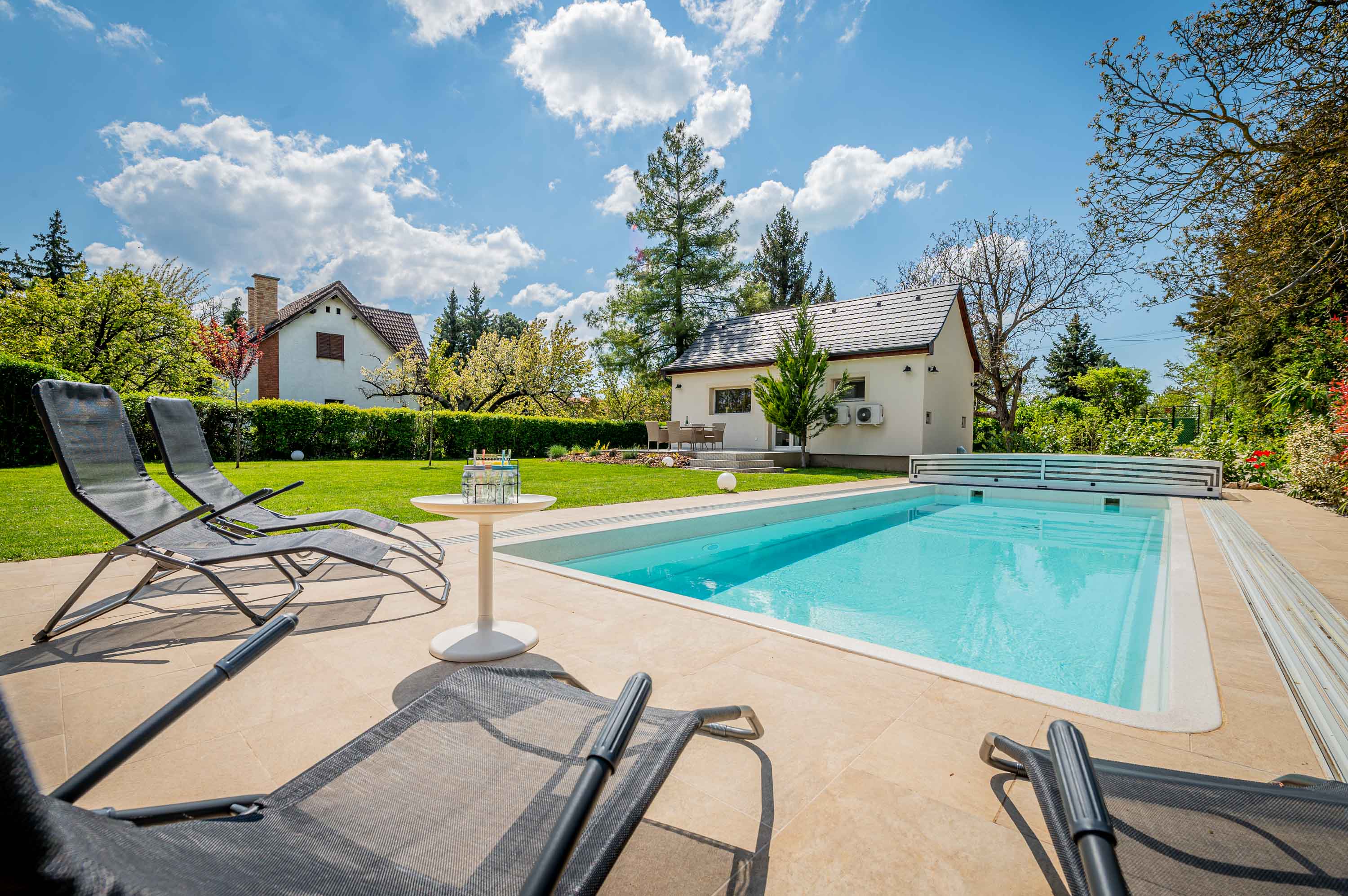 A medence 10x3,5 m-es, 1,4m-es mélységgel, könnyen kezelhető fedéssel rendelkezik. A medence körül napozóágyak, kinti fürdőszoba és solarzuhany, a kertben függőfotel és függőágy teszik még kényelmesebbé a pihenést.