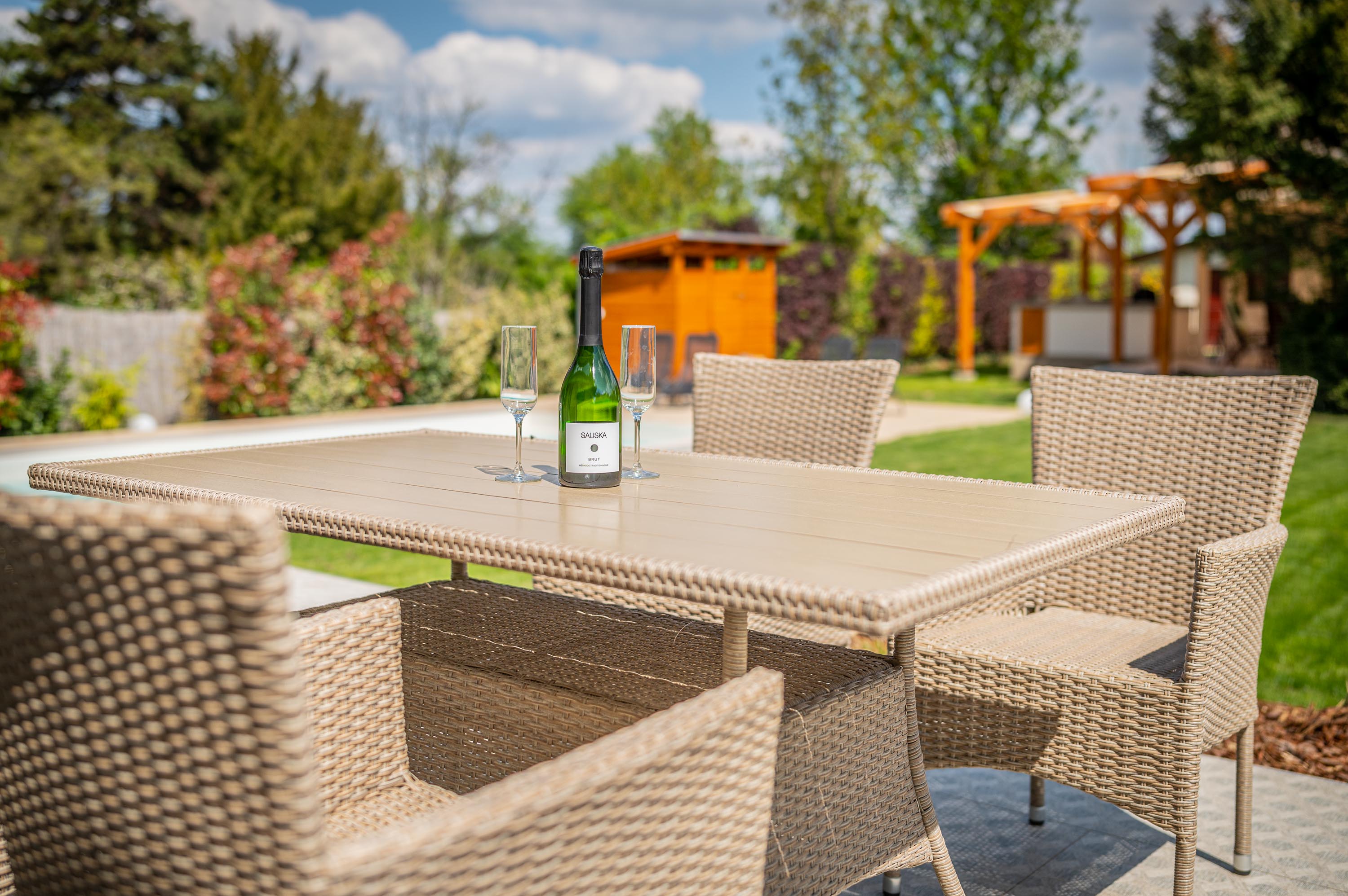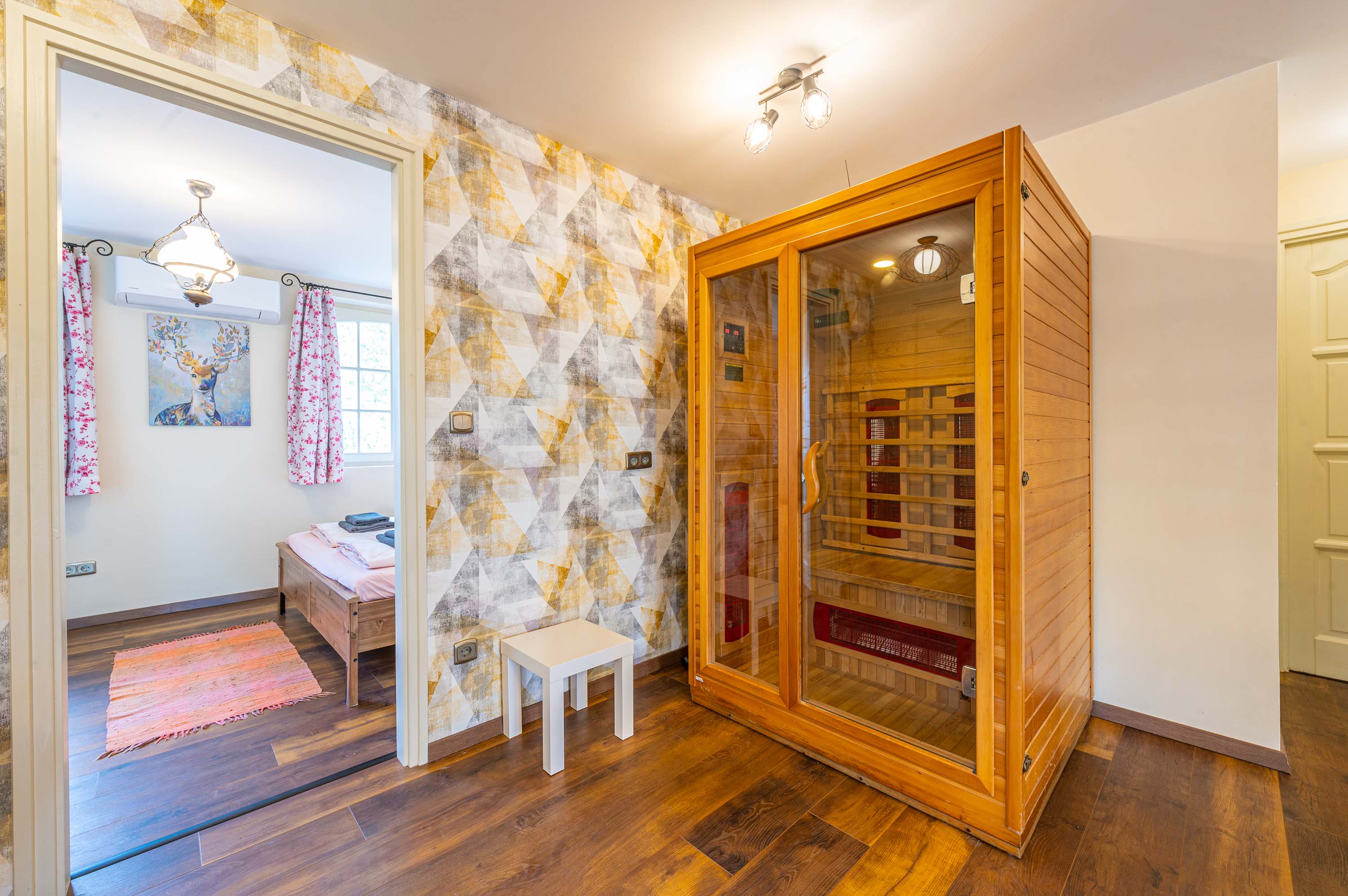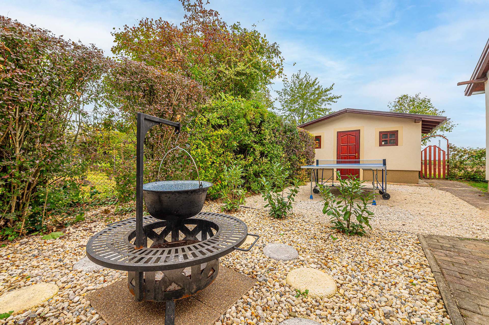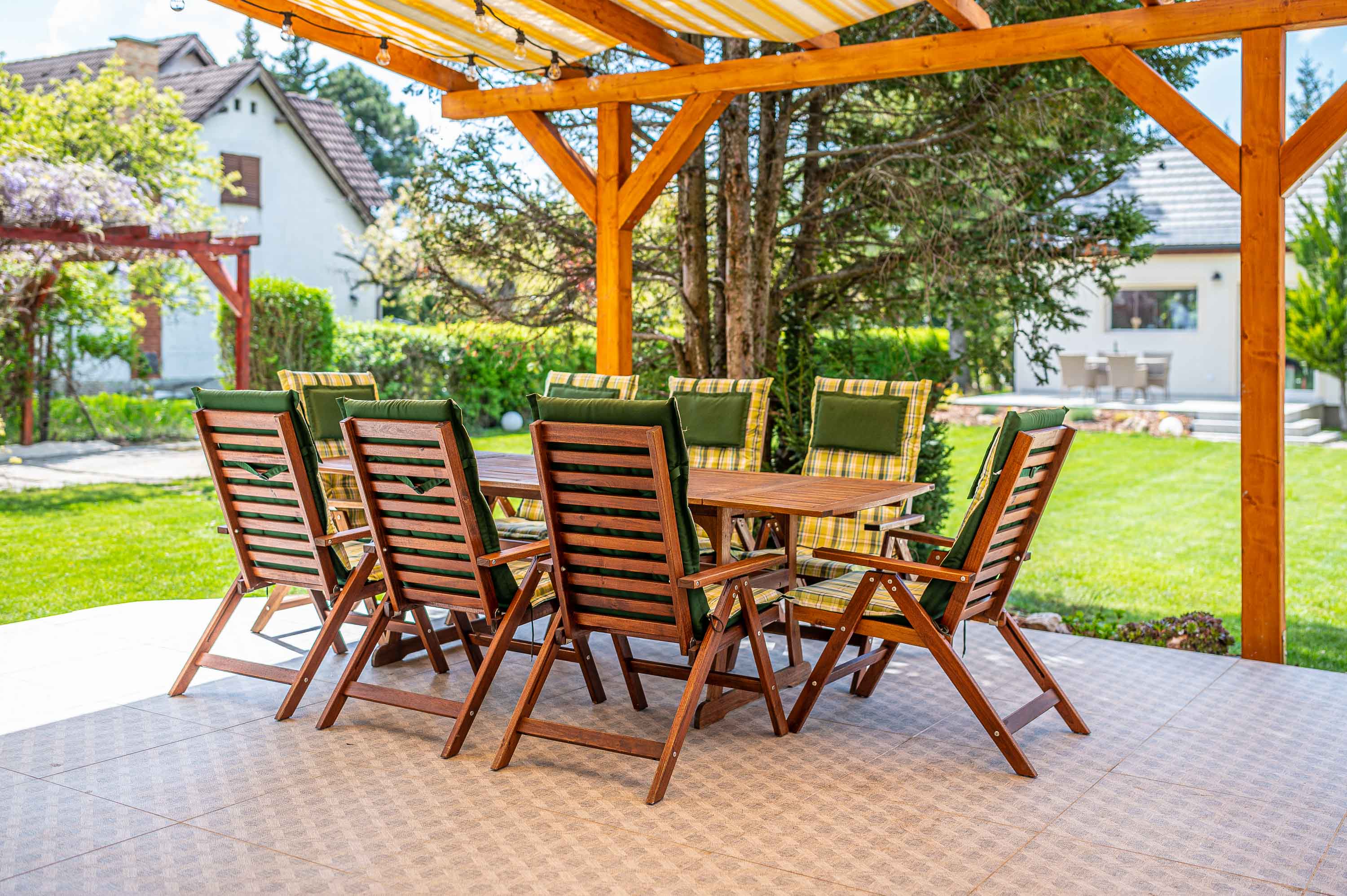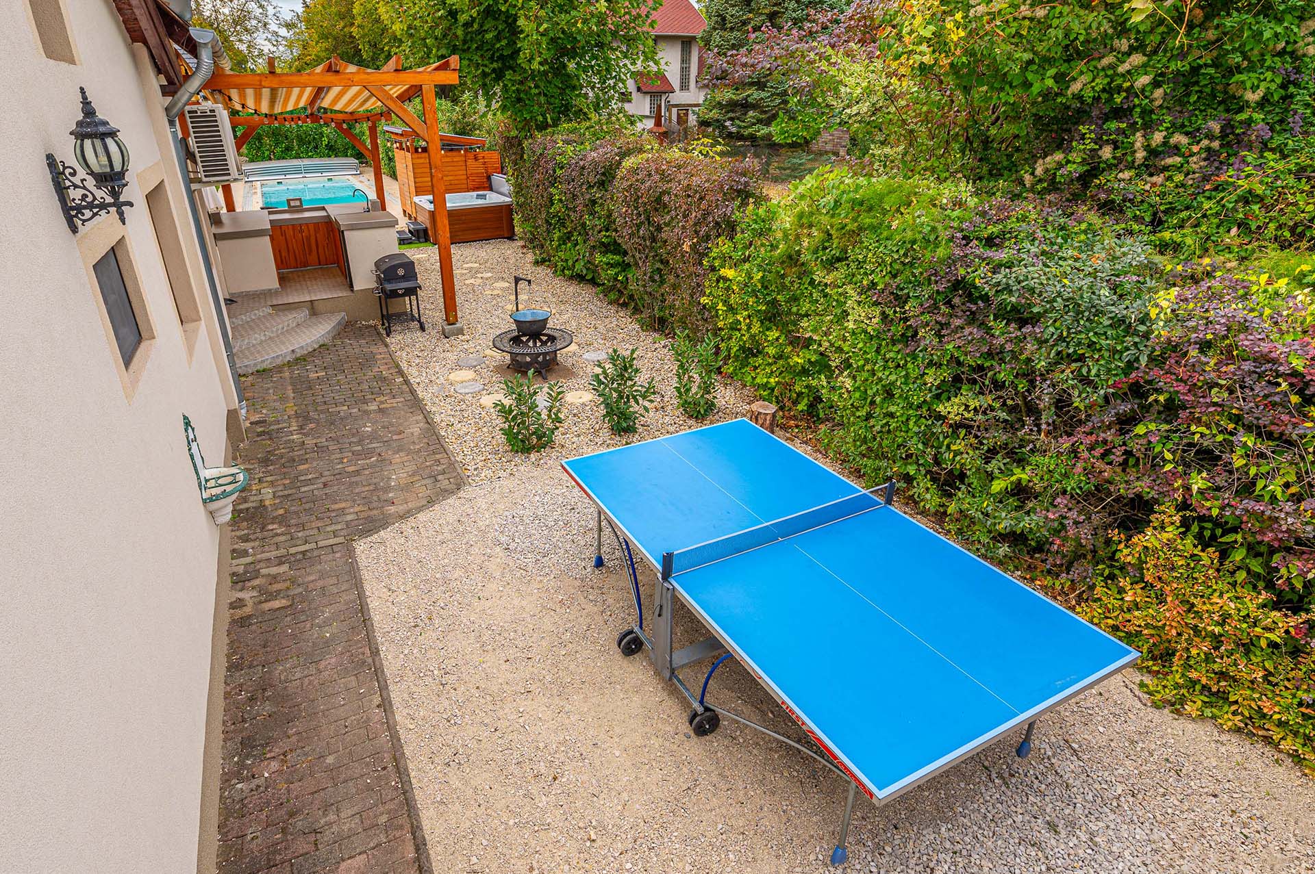 A medence 10x3,5 m-es, 1,4m-es mélységgel, könnyen kezelhető fedéssel rendelkezik. A medence körül napozóágyak, kinti fürdőszoba és solarzuhany, a kertben függőfotel és függőágy teszik még kényelmesebbé a pihenést.